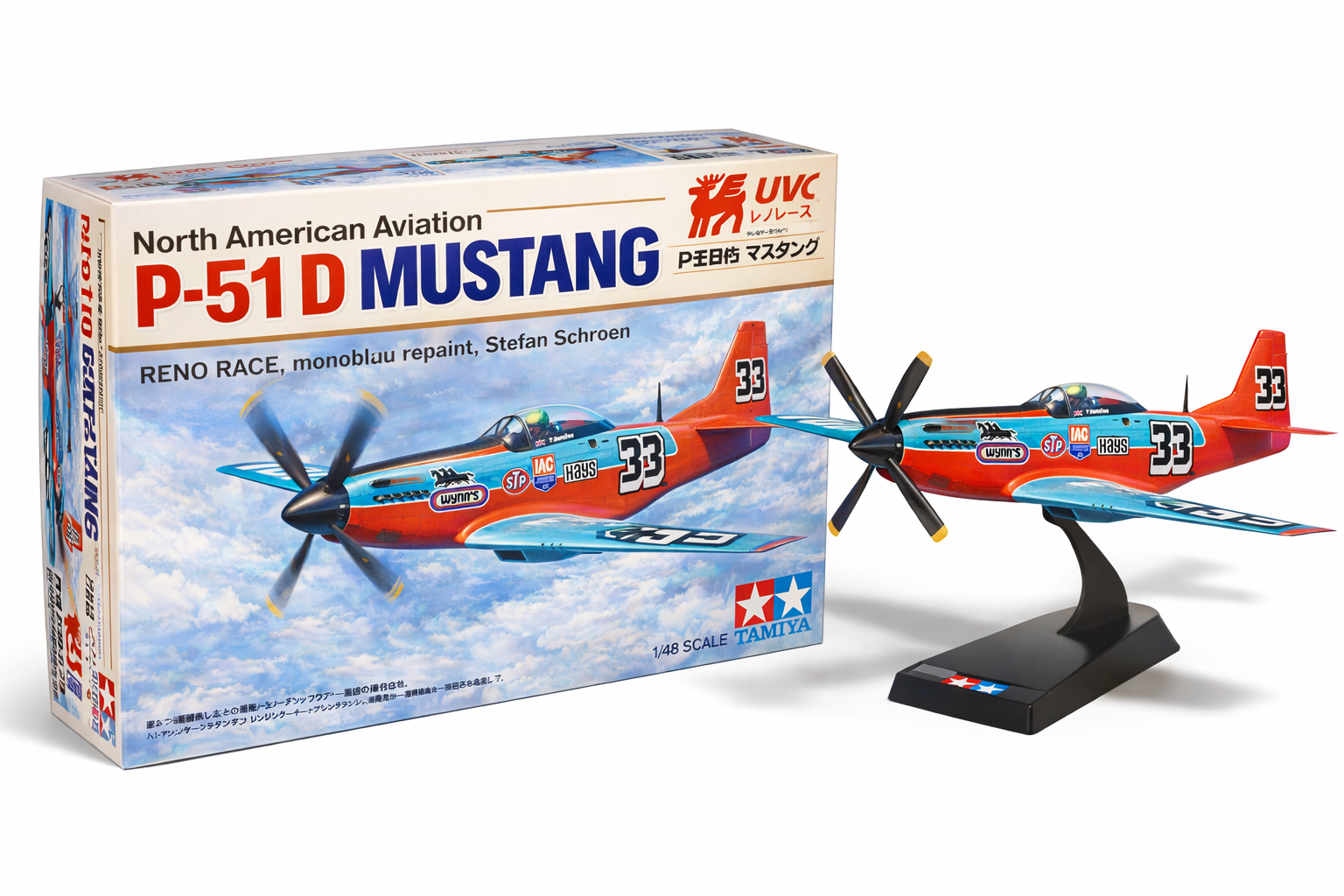 // scale model kit box cover design, North American Aviation P-51D Mustang Reno race aircraft, monoblau repaint by Stefan Schroen, classic model kit packaging layout, bold typography "P-51D MUSTANG", product branding UVC with red deer logo, Japanese small text details, Tamiya style layout, aviation model kit box graphic design //