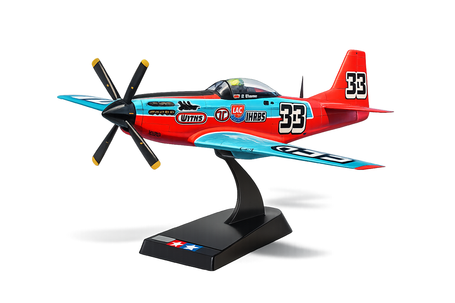 // fully assembled 1/48 scale North American P-51D Mustang Reno race aircraft model on display stand, monoblau repaint turquoise blue and red racing livery, sponsor decals and number 33, clean studio lighting, product photography style, isolated with soft shadow //